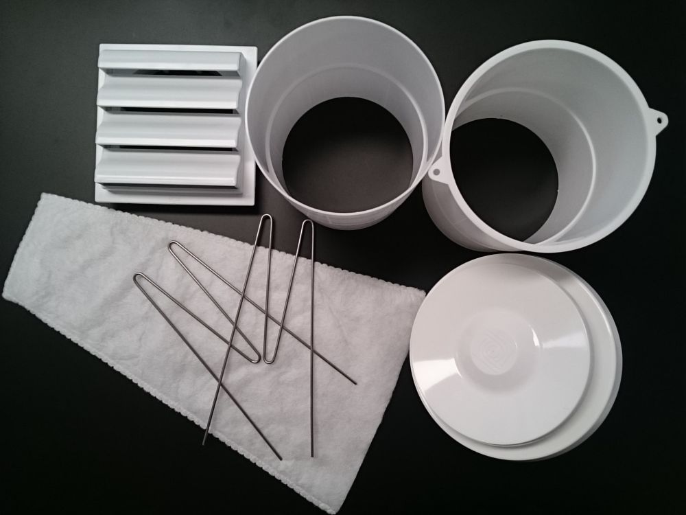 Im Paket enthalten sind das thermostatisch gesteuerte Velco VT-125 Frischluftventil, die Filtereinheit, ein Wandrohr, ein Verlängerungsrohr sowie ein Außenlüftergitter.